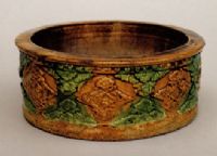 說 明: 淡黃色陶胎,較堅硬,上白色化妝土,內(nèi)施黃釉,紋飾講究對稱,作工精巧.
