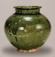 說 明: 胎質較粗,紅褐色。胎壁內外掛白色陶衣,表面施綠釉,施釉不均。