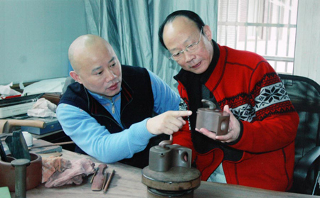 為弘揚(yáng)陶都宜興800年紫砂文化,展示當(dāng)今紫砂藝術(shù)最新成果,迎接祖國(guó)60年華誕,由中國(guó)工藝美術(shù)大師呂堯臣、江蘇省工藝美術(shù)大師呂俊杰父子二人首度合作的《呂氏陰陽(yáng)太極壺》歷經(jīng)4年日前在宜興問(wèn)世!
