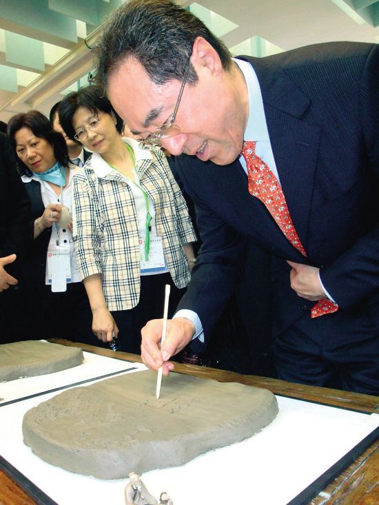 在創(chuàng)意產(chǎn)業(yè)園內(nèi)一幅主題為“珠三角之夢”的陶瓷制作的地圖旁,唐英年應邀在陶坯上刻下“創(chuàng)意無限”四個大字。
