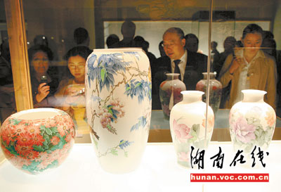 “白如玉、明如鏡、薄如紙、生如磬”是醴陵瓷器所受的美譽。它的釉下五彩瓷瓷質(zhì)細膩,畫工精美,清新雅麗。今天下午,“歷史的釉光----醴陵釉下五彩瓷珍品展”在首都博物館正式展出。全國人大常委會原副委員長顧秀蓮和國家工商總局局長周伯華、原國土資源部部長孫文盛、原中紀委副書記夏贊忠等中央有關(guān)部門領(lǐng)導(dǎo)和湘籍在京老同志出席了開幕式。