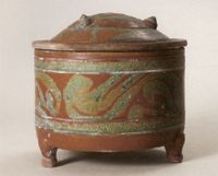 說(shuō) 明: 器身以醬黃色為底襯,繪刻出弦紋,并用綠彩會(huì)出卷云紋,這件陶奩紋飾流暢,色彩絢麗,制作精細(xì)。