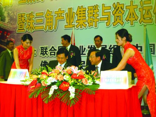 中國產業(yè)集群及資本運作(佛山)國際示范城市項目簽約儀式暨珠三角產業(yè)集群與資本運作的可持續(xù)發(fā)展論壇4月23日在佛山市舉行。佛山市市長陳云賢與聯合國工業(yè)發(fā)展組織中國投資促進處首席代表胡援東共同為項目簽約。