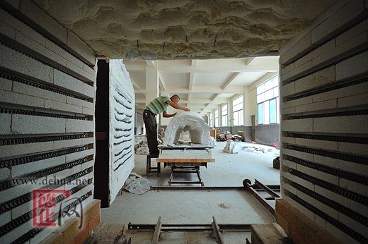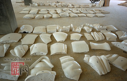 模具成型后,又將其無規(guī)則地分解成138塊,其中身體137塊,頭部、臉部組成1塊,然后從頭到腳對每一塊進(jìn)行統(tǒng)一編號。接著創(chuàng)作人員參照模具雕制出每一塊坯體,坯體的厚度均在3厘米--5厘米以上,最厚的達(dá)20厘米以上,是平常燒制藝術(shù)瓷的100倍。頭部坯體高140厘米,寬110厘米,厚80厘米,重約250千克,需6個(gè)人同時(shí)出力才能翻動它。
