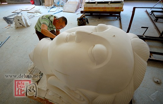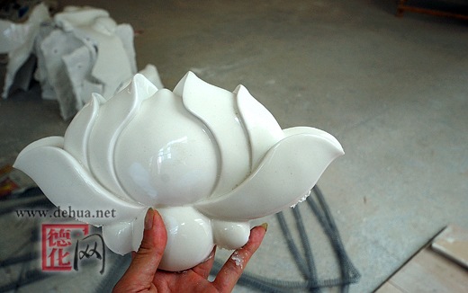 據(jù)了解,“渡海觀音”燒成后高達(dá)6.4米,由國家級工藝美術(shù)大師蘇清河領(lǐng)銜打造。2008年10月,在采訪這位瓷雕大師時(shí),筆者在鵬祥工業(yè)區(qū)大型瓷雕“渡海觀音”的燒成車間里看到,地板上擺放著無數(shù)塊狀的坯體,兩座電腦自動控溫的電窯正進(jìn)行坯體燒制。