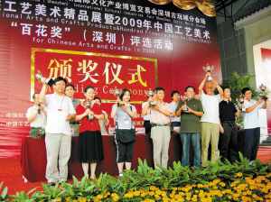 2009年中國(guó)工藝美術(shù)“百花獎(jiǎng)”昨天揭曉,連紫華的陶瓷作品《西方三圣》、于涇的玉雕作品《5·12》等72件作品獲金獎(jiǎng)。