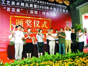 中國(guó)工藝美術(shù)往何處去?如何實(shí)現(xiàn)工藝美術(shù)技藝到文化創(chuàng)意產(chǎn)業(yè)的華麗轉(zhuǎn)身?昨天下午,在激動(dòng)人心的2009中國(guó)工藝美術(shù)“百花獎(jiǎng)”頒獎(jiǎng)典禮后,羅湖區(qū)委常委、常務(wù)副區(qū)長(zhǎng)倪澤望,羅湖區(qū)文化局局長(zhǎng)張遠(yuǎn)翔,中國(guó)輕工珠寶首飾中心副主任張淑榮和來(lái)自全國(guó)各省市的工藝美術(shù)大師以及眾多的行業(yè)精英一起,在文博會(huì)古玩城分會(huì)場(chǎng)卓氏畫院,分享了一場(chǎng)思想的盛宴——2009全國(guó)工藝美術(shù)“高峰論壇”。