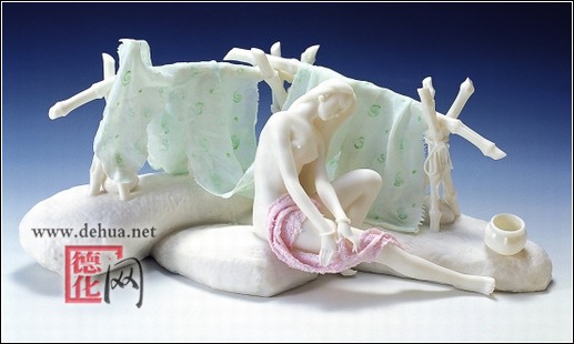l萬元?陳桂玉嚇了一跳。但思忖片刻,還是以實相告:這是件次品。對方一聽,急了:“什么是次品?真正的藝術(shù),哪怕它有這樣那樣的不足都是值得的。”就這樣,他們賣出了第一件高價作品。從此,陳桂玉夫婦信心倍增,技藝也愈發(fā)精湛。整整兩年,他們埋頭創(chuàng)作,積攢了一大批絕美的瓷雕作品:《天鵝湖》、《三月三》、《山鬼》……在1995年后的三年里,陳桂玉夫婦分別在德化、新加坡和香港舉辦了個人瓷雕作品展,均大獲成功,作品《山鬼》更是創(chuàng)下了單件作品18萬元的高價。