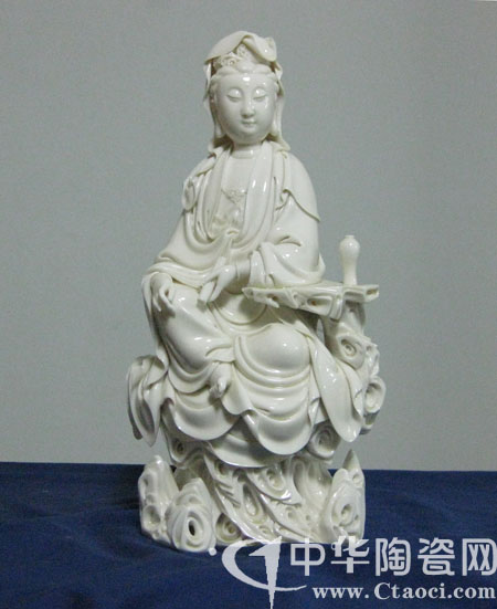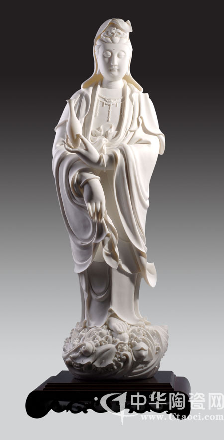 9、《自在觀音》》——由福建省工藝美術(shù)大師陳明良創(chuàng)作,2008年被英國珍寶博物館收藏,2008年香港舉辦的地震賑災慈善拍賣會上拍出18萬元,作品采用德化優(yōu)質(zhì)瓷泥,經(jīng)1320度燒制而成的“白玉瓷”,它的瓷質(zhì)堅實厚重,胎釉結(jié)合致密,俗稱“糯米胎”,瓷色潔白如雪,溫潤如玉,透明度好,是德化白瓷的上等珍品瓷種。