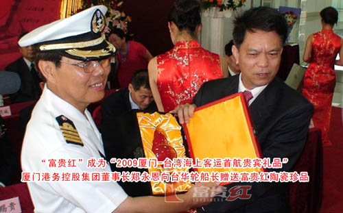2009年4月8日,為構(gòu)建職業(yè)教育交流平臺,促進兩岸經(jīng)濟文化雙贏,由第十三屆臺交會組委會、福建省中華職業(yè)教育社、臺灣教育會、廈門市政協(xié)教科文委和廈門市教育局等主辦的2009海峽兩岸高等職業(yè)教育展覽會在廈門會展中心開幕,共有來自海峽兩岸的100余所高等職業(yè)院校參展。全國政協(xié)常委、港澳臺僑委員會副主任陳明義,福建省委常委、廈門市委書記何立峰,全國人大常委林強等領(lǐng)導(dǎo)出席了開幕儀式。富貴紅珍品《小金瓶》成為本次展覽會唯一指定禮品。2009年4月22日,廈門—臺灣海上客運首航儀式在廈門市海峽郵輪中心舉行。福建省委常委、廈門市委書記何立峰,海峽兩岸航運交流協(xié)會理事長胡漢湘,臺灣航業(yè)股份有限公司董事長張義源等出席了啟動儀式。儀式結(jié)束后,有關(guān)領(lǐng)導(dǎo)和人士共同轉(zhuǎn)動起航航舵,臺華輪正式起航,開啟了廈門對臺滾裝客運的新篇章。富貴紅珍品《福祿連枝》、《觀月聽潮》成為本次活動的貴賓禮品。