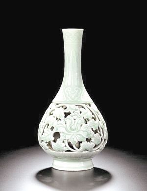 在4月上旬蘇富比春拍的“玲瓏八寶——歐洲私人清宮御瓷收藏專場”中,8件拍品悉數(shù)拍出,總成交額高達9552萬港元。而其中拔得頭籌的清乾隆粉青釉浮雕芭蕉葉鏤空“纏枝牡丹圖”長頸膽套瓶,最終以4770萬港元成交,創(chuàng)下單色釉瓷器拍賣紀(jì)錄。
