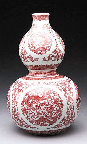 5月29日,在中國嘉德2009春季拍賣會上,瓷器工藝品專場中清乾隆“釉里紅團螭龍紋葫蘆瓶”以1332.8萬元高價成交,摘得瓷器工藝品部分桂冠。