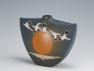姜氏現(xiàn)代彩陶的特點(diǎn)在地其造型的處理,特別是尺度和比例關(guān)系方面,姜氏現(xiàn)代彩陶能夠突破以往的習(xí)慣比例關(guān)系,強(qiáng)調(diào)尺寸大小的對(duì)比變化,所以形成了比較突出的很強(qiáng)的形感,并能重新達(dá)到一種和諧美。這種大膽創(chuàng)新的設(shè)計(jì),突破了對(duì)稱形的限制,因而出現(xiàn)了很多非圓形的異形器造型,而整體呈均衡狀態(tài),其中不乏新穎別致的造型樣式。再加上姜氏現(xiàn)代彩陶獨(dú)特的裝飾工藝手法,把原始彩陶質(zhì)樸的韻味和現(xiàn)代陶藝清新的格調(diào)結(jié)合在一起,使彩陶視角效果豐富多樣,色彩含蓄厚重,風(fēng)格素雅古樸,給人以全新的感覺。