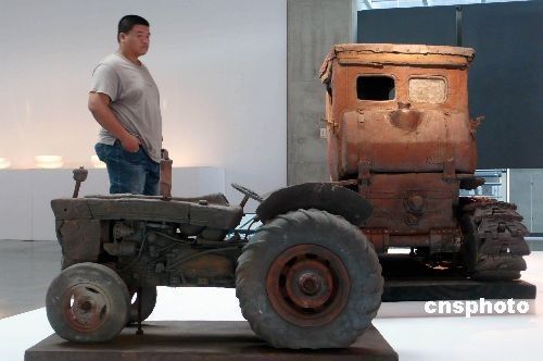 中國美術(shù)館委托中央美術(shù)學(xué)院雕塑系教授呂品昌策劃的“文思·物語——大陸當代陶藝展”,6月3日在臺灣陶藝重鎮(zhèn)臺北縣鶯歌鎮(zhèn)揭幕。圖為一臺北觀眾在觀賞鈔子藝、鈔子偉兄弟仿上世紀五六十年代大陸農(nóng)用拖拉機制作的陶瓷作品《勞力士系列》。中新社發(fā)劉舒凌攝