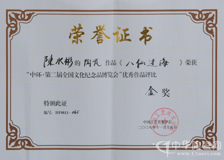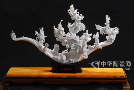 陳水彬以德化溫潤(rùn)如玉的“中國(guó)白”為載體,演繹出了形神兼?zhèn)涞?ldquo;八仙過(guò)海”。作品潔白細(xì)膩而又堅(jiān)實(shí)厚重,長(zhǎng)90 cm,寬25cm,高62cm,燒制難度極高,收成率低。作品造型和諧,層次分明,八位神仙各就其位,各持法寶,各顯神通。大大的海浪采用夸張的手法,顯示出海浪的波濤洶涌,動(dòng)感力度極強(qiáng)。感人的作品都源于生活,陳水彬的海浪也是受大自然魅力的感染,又深得福建省工藝美術(shù)大師楊劍民的真?zhèn)鳎瑢⒑@说捏@濤駭浪雕刻得栩栩如生,表現(xiàn)出高超的雕刻技藝。作品將傳統(tǒng)的歷史題材賦予時(shí)代的精神,展示出了在這國(guó)際金融危機(jī)的驚濤駭浪中攜手同進(jìn),展示了在這競(jìng)技的時(shí)代各展才能。(蘇曉霞)