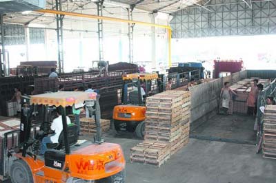 廠房內(nèi),機器轟鳴,三條生產(chǎn)線上的作業(yè)工人忙于將拋光磚成品從流水線上取下,三臺叉車在車間來往穿梭,將仍冒著熱氣的瓷磚徑直送到車間門口。車間是敞開式的,為運貨汽車留有兩個專門的裝貨口。每個裝貨口并排停著三輛加長的汽車,都已裝了大半車廂的產(chǎn)品。