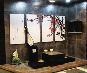 書法瓷磚對(duì)準(zhǔn)了人們懷舊古時(shí)文化的眼光,以隨性取勝,這種氣息更賦予了房間沉穩(wěn)、書香的氣度,甚至讓人錯(cuò)亂了對(duì)時(shí)空的認(rèn)知。唐朝詩人張旭的草書《古詩四帖》、《金剛經(jīng)》的段落、《大唐金甲》等都成為仿古瓷磚上的“表面文章”.除了不同字體的書法作品外,作為房屋裝修主力的瓷磚在學(xué)識(shí)上并不呆板單一,一首王安石的《梅花》詩旁配飾了一幅傲骨錚錚的梅花圖,詩句部分的瓷磚僅占梅花圖瓷磚大小的三分之一。而且墻磚上的文字不只局限于漢字,一段梵文的古經(jīng)被附于墻磚之上,盡管研究梵文的人不多,但對(duì)于偏“冷門”文字的上書表明了瓷磚文化的多元廣大。