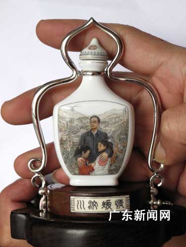 工藝美術(shù)師、微畫家吳永康歷時(shí)四個(gè)月,在一個(gè)小鼻煙殼上創(chuàng)作出一幅三點(diǎn)五厘米乘三點(diǎn)七厘米見方的微瓷畫“情暖汶川”,以總理溫家寶為主體,以各救援場景為背景,畫中繪出六十六個(gè)人物,細(xì)微之處,只有芝麻一半細(xì)小的人物臉部表情也清晰可見,落墨如絲,微妙生輝,其畫線只有發(fā)絲的三分之一,線條和文字的細(xì)小都創(chuàng)下了微瓷畫記錄,畫之精美,可謂在陶瓷上繡花。圖為吳永康的“情暖汶川”微瓷畫。