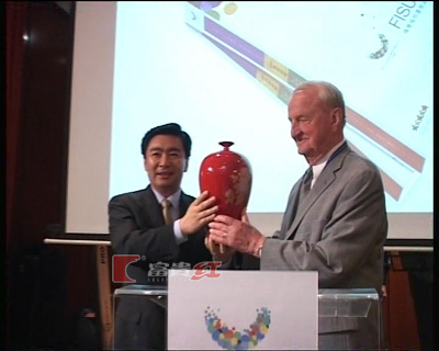 7月11日,在貝爾格萊德舉行的“深圳之夜”晚宴上,嘉賓云集,王榮市長(zhǎng)鄭重地向喬治·基里昂贈(zèng)送了由福建省富貴紅文化發(fā)展有限公司制作的高溫紅釉瓷珍品《新梅瓶》。