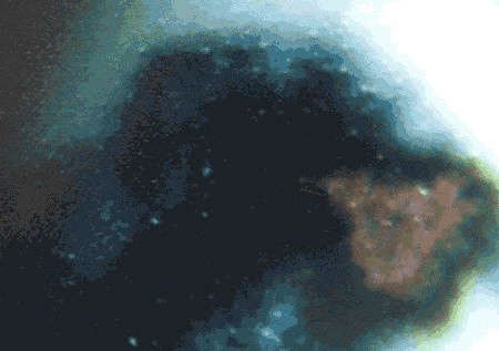 景德鎮(zhèn)落馬橋窯址出土元青花殘片標本放大圖,看到活躍的凝聚斑上浮至釉面,其中的鐵元素在釉表面形成鐵銹斑。