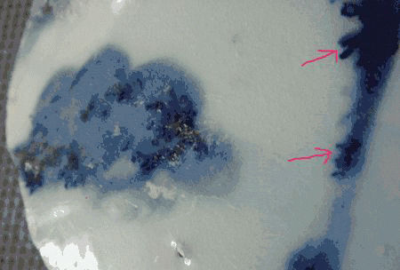 2、凝聚斑是青花繪畫中鈷料和雜質(zhì)濃縮的部分,即下滲入胎骨,又上滲入釉中,活動性最強。