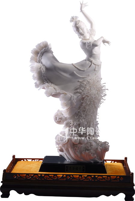 《雀之靈》通過建白瓷淋漓盡致地表現(xiàn)了富含云南民族傳統(tǒng)文化的傣族舞姿,融兩地特色為一體,充分表達了對云南、福建兩地共同繁榮發(fā)展的祝福!作品造型豐滿、和諧,通過手指、腕、臂、胸、腰、髖等關(guān)節(jié)的一波三折,惟妙惟肖展示出了優(yōu)美的舞姿,柔若無骨又寸寸是節(jié)。一雙水靈靈的眼睛,俊俏高挺的鼻梁,微合的櫻桃小嘴,嘴角自然地微微上揚,柔美的線條勾畫出一副恬靜而安詳?shù)哪橗。她的陶醉、沉迷像是在與上蒼對話,俯仰天地,與自然的靈氣融為一體,超強磁性的文化藝術(shù)凈化了塵世的心靈,“只可遠觀而不可褻玩焉”。