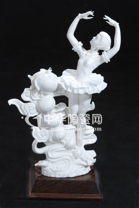 《好運來》以德化特有的“中國白”為胎體,瓷質(zhì)堅實厚重,瓷色潔白如雪,溫潤如玉,透明度好,是德化白瓷的上等珍品瓷種,榮獲“第七屆中藝杯”金獎。作品精雕細刻,造型和諧,祥云托著六個燈籠高高掛起,少女踮起腳尖隨著優(yōu)美旋律而舞動,意境深邃、超凡脫俗。六個燈籠代表60周年,祥云象征著吉祥,承載著幾千年的中國文化,具有代表性的中國文化符號。祥云托起燈籠蘊涵著蘇志強對祖國騰飛的期盼。少女的翩翩起舞,舞的是喜慶新中國成立一甲子年,舞的是中國60年來的喜和淚,舞的是2009年是我們繼往開來的一年……少女身上洋溢的氣息也正影射著祖國的年輕,祖國也正處于朝氣蓬勃、年輕氣盛的時期,無人可以想象祖國的未來將是多么輝煌!