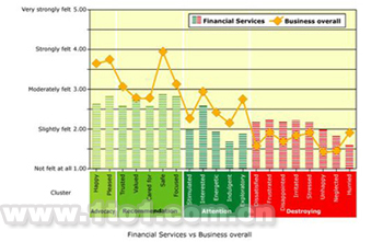 在上圖中,“綠色”代表推動(dòng)價(jià)值的情感。“紅色”代表破壞價(jià)值的情感。反映在圖表上你當(dāng)然希望綠柱盡可能高一些 (比如,盡可能“非常強(qiáng)烈地感覺(jué)到”) 同時(shí)紅柱盡可能低 (盡可能接近“完全感覺(jué)不到”) 。黃線代表客戶對(duì)各種類型業(yè)務(wù)(B2B與B2C)的平均情感響應(yīng)。它是對(duì)普通客戶情感期望的最真實(shí)反映,也是客戶情感響應(yīng)的基準(zhǔn)。條紋柱狀體代表FSP總體的情感響應(yīng)。上圖反映的情況并不妙。因?yàn)镕SP在“紅色”部分高于基準(zhǔn)而在“綠色”部分低于基準(zhǔn)。必須指出的是,任何一家企業(yè)的具體情況都有可能不同于這里呈現(xiàn)的行業(yè)整體情況。