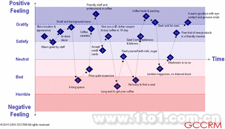 以下是一個單線程的客戶體驗鏡像,由Sampson Lee先生提出并融合了他在訪問星巴克期間的心得體會。它從Sampson的角度出發(fā)向我們展示了他與星巴克之間的互動。同時該鏡像也糅合了反映Samson在流程每個階段感受的因素在里面。思考一下第五條和第七條——‘排很長的隊’和‘咖啡要等很長時間’。Sampson也許趕時間,所以將這些歸為負面體驗。但如果他在排隊時碰到個很久沒見的老朋友也許他的想法就完全不同了,因為排長隊的時間讓他有機會了解到這位朋友可能在計劃舉辦一次社交活動之類的訊息。