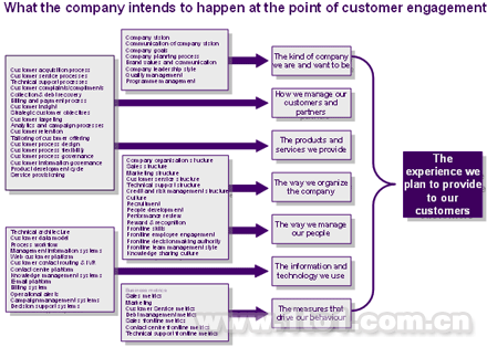 評估客戶體驗的各個組成部分然后利用系統(tǒng)化思維逐層分析其建立過程,最終你將發(fā)現(xiàn)所有必須具備和必須進行管理的能力。下圖向我們展示了如何剖析能力從而從內(nèi)部觀點——“企業(yè)期望發(fā)生的”和外部觀點——“客戶的實際體驗”兩方面找出客戶體驗的根本動力。