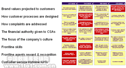 上面的能力鏡像圖表明新品牌的價值觀傾向于能夠極大地提升客戶期望的第四壘。同時客戶處理流程和培訓設置在第二壘而決策制定在第三壘,集中體現(xiàn)為海報廣告和管理層‘干涉’,主導文化仍由成本推動。當這些與第一壘的績效度量(呼叫處理時間) 和第一壘的獎勵與認可計劃 (呼叫處理數(shù)量) 碰在一塊時 產(chǎn)生的效果就是在退賠償及其它客戶參與的實際行為中制造出大量不協(xié)調(diào)因素。在評估之前企業(yè)并沒有看到這一點。而一旦看清楚這張圖解決方案也就呼之欲出了。