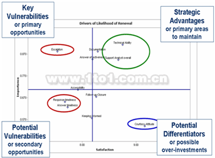目標化客戶反饋能夠提供與能力直接相關(guān)的關(guān)鍵外部數(shù)據(jù)來源?纯匆韵聛碜訡ustomerSat公司的圖表。它識別出了企業(yè)未能滿足的重要需求(左上部框) 。Customer Sat工具隨后對現(xiàn)有數(shù)據(jù)進行進一步的分析或者觸發(fā)事件搜集新數(shù)據(jù)從而精確指出影響成果的能力。一旦這個問題明確之后Round能力管理系統(tǒng)就會框定和追蹤彌補缺憾所需的能力的開發(fā)進程。
