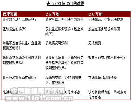 顯然,任何企業(yè)對(duì)員工的控制力遠(yuǎn)遠(yuǎn)超過對(duì)客戶的控制力。這意味著,員工參與的互動(dòng)可以在最大程度上得以規(guī)范和控制。例如,公司可培訓(xùn)員工如何接待一位惱怒的顧客或者如何處理違反規(guī)定的退貨。另一方面,客戶之間的互動(dòng),不一定發(fā)生在公司的營業(yè)所?赡馨l(fā)生在外面,或者在虛擬的網(wǎng)絡(luò)社區(qū)。這些互動(dòng)是難以監(jiān)督,更不用說去控制了。下面的表格中描述了CEI與CCI的主要區(qū)別。