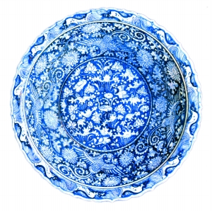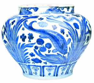 另外,這些青花瓷都是專門為出口貿(mào)易所設(shè)計(jì)的,因此帶有中西結(jié)合的特色。“唐代到元代統(tǒng)治者都很喜歡單色釉,元代宮廷用瓷也是以單色瓷為主,而元代青花瓷很多是為了伊斯蘭文化而特別設(shè)計(jì)的。”蔣女士談道。比如,一件花卉圖案的大盤沒有韻散,便是用了“撒藍(lán)”的技法——在畫完了紋飾以后,又把鈷料噴灑在上面,所以可以感覺到這個(gè)器物上面朦朦朧朧有一層藍(lán)色;再如,整個(gè)的青花瓷它的裝飾很滿,器形也較大,這些都很符合當(dāng)時(shí)的伊斯蘭文化,表現(xiàn)了他們對青藍(lán)的喜好。