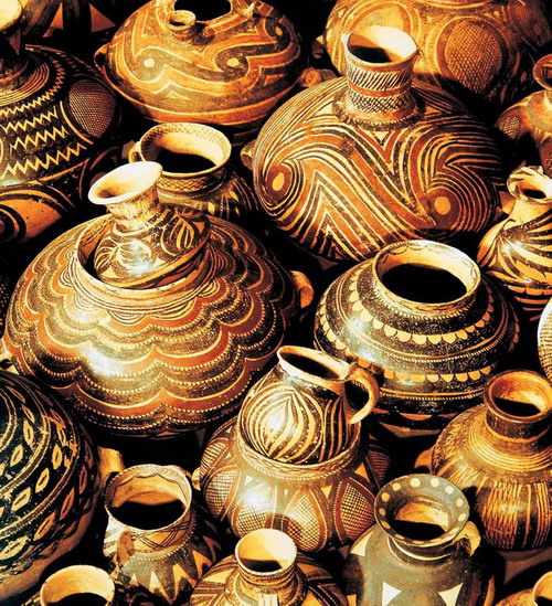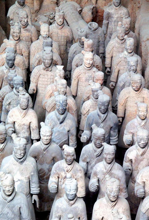 陶經(jīng)過了從灰陶、黑陶、白陶到印紋硬陶、彩陶的發(fā)展變化之路,在陶器的造型上也經(jīng)歷了由簡單到復(fù)雜、由粗放到精細(xì)、由平淡到生動(dòng)的漸進(jìn)過程。早期陶最負(fù)盛名的作品之一是出土于陜西臨潼秦始皇陵陪葬坑的兵馬俑,也叫秦俑。秦俑位于陜西臨潼附近,是秦始皇陵的一部分。自1974年開始,迄今已發(fā)掘了呈品字排列的三個(gè)俑坑,出土了真人大小的兵馬俑6000余個(gè),其中有活馬大小的陶馬30余匹,戰(zhàn)車100余乘,組成了規(guī)模宏大的秦俑博物館。一號(hào)坑規(guī)模最大,長230米,寬62米,深5米,面積達(dá)14260平方米,是主力步兵戰(zhàn)陣,排列著一個(gè)一個(gè)整齊威武的軍隊(duì)方陣,間有雄健高大的戰(zhàn)馬。陶俑有士兵、馭手、鎧甲軍士、軍官、將軍,姿勢(shì)有立姿、跪射姿。二號(hào)坑略小,是騎兵戰(zhàn)陣,有戰(zhàn)車上千輛。三號(hào)坑最小,僅有六七十個(gè)軍官和將軍俑,似為指揮部。這些兵馬俑做工極其精良,須發(fā)畢現(xiàn),面部表情生動(dòng),姿態(tài)自然,衣紋流暢,顯示出嚴(yán)肅剛強(qiáng)、器宇軒昂的神態(tài),戰(zhàn)馬也敦實(shí)有力、蓄勢(shì)待發(fā)。這形象地證明了當(dāng)時(shí)中國陶瓷技術(shù)達(dá)到了何等卓越的水平!這是一支為秦始皇死后護(hù)衛(wèi)的冥軍,為了建造它,老百姓付出了慘痛的代價(jià),但是也為我們留下了這舉世矚目的珍寶,被譽(yù)為“世界第八大奇跡”!現(xiàn)任法國總統(tǒng)、當(dāng)時(shí)的總理希拉克說:“不見金字塔,就不算到過埃及;不見兵馬俑,就不算到過中國!” 字串5