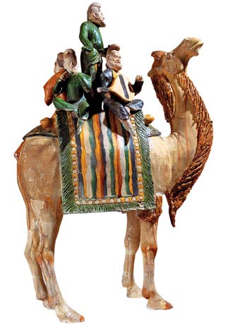 唐三彩駱駝?shì)d樂俑,陜西西安鮮于庭誨墓出土。