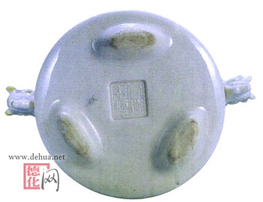 這尊魚(yú)龍雕塑香爐,直徑12厘米,高6厘米,呈玉白釉色,細(xì)膩?zhàn)虧?rùn),兩邊對(duì)稱的魚(yú)龍雕塑,緊緊地貼著爐身,魚(yú)龍棱角分明,鱗片清晰,造型優(yōu)雅,生動(dòng)活潑。爐腰身微微收束,成弧形,腰間有條回紋圖案點(diǎn)綴器物,多了靈氣,更顯古樸大方。爐里外包括爐底,均勻地施著玉白色釉,三足鼎立,僅足底露出點(diǎn)胎體,可見(jiàn)瓷土淘洗干凈,胎骨緊密,爐全身為細(xì)開(kāi)片,錯(cuò)落有致。爐底有一篆書(shū)寄年款“宣德年制”,字體端莊整齊,此乃罕見(jiàn)之器物。在眾多的漳州窯里,很難找到帶寄年款的珍貴器物,應(yīng)是明晚期的產(chǎn)品。