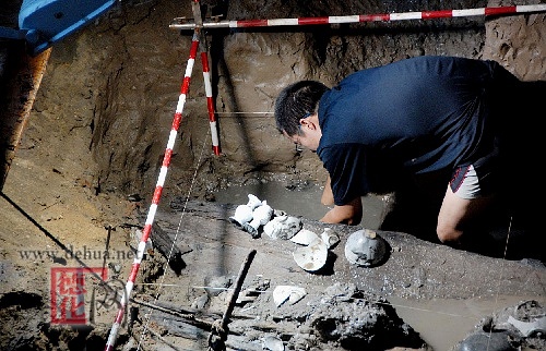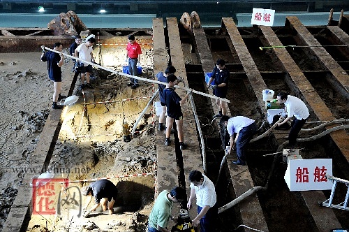 廣州,2009年9月26日 “南海Ⅰ號”考古發(fā)掘 部分文物露真容 9月26日,考古工作人員正在發(fā)掘“南海Ⅰ號”。 當(dāng)日,入住“水晶宮”兩年的南宋沉船“南海Ⅰ號”第一階段試掘工作結(jié)束。記者從考古現(xiàn)場了解到,考古人員在“南海Ⅰ號”上發(fā)現(xiàn)了保存完好的船艙、船舷和上甲板,并出水了200多件來自江西景德鎮(zhèn)和福建德化等地民窯的精美瓷器。