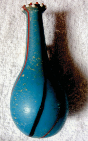 公元六一七年李淵父子在晉陽起兵反隋,李淵于公元六一八年稱帝,世稱唐高宗,建帝都于長安,唐代共歷時近三百年,在唐太宗李世民執(zhí)政的貞觀年間,國力強盛國土寬闊,可謂雄風豪邁,四方各國紛至沓來朝貢,往來于“絲綢之路”與大唐帝國建立貿(mào)易關系,國民經(jīng)濟大步發(fā)展,即后世稱為“貞觀盛世”也,當時由宮廷制作的絢麗多姿出神入化的唐代金銀器和琉璃器亦稱譽世界。雖然琉璃器于漢魏時期由埃及西歐等國作為貢品進入中國,但至唐代時中國已能吹制出質(zhì)量很高、器壁極薄、光亮度極美的琉璃重器,備受世人珍愛。   本文所示圖為唐代四色琉璃鑲嵌寶瓶。此瓶系用唐代的手工鑲嵌吹制工藝,造型優(yōu)美流暢。雖遍體疤痕滿布粉色“銀釉”,卻掩蓋不住它“寶光四射”的英姿。在深綠色的瓶體上嵌入靛藍、玫紅色琉璃線各二條盤旋而上至瓶口,讓觀者有種隨風起舞之感,而曲線優(yōu)美的瓶頸自然地延伸至瓶口,造型猶如一顆碩大碧水自天而降。瓶口向外翻卷并在上面鑲嵌二排紅色及白色的琉璃珠,盡顯唐王朝工匠高超的技藝和聰明才智。