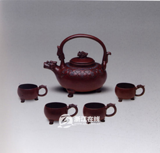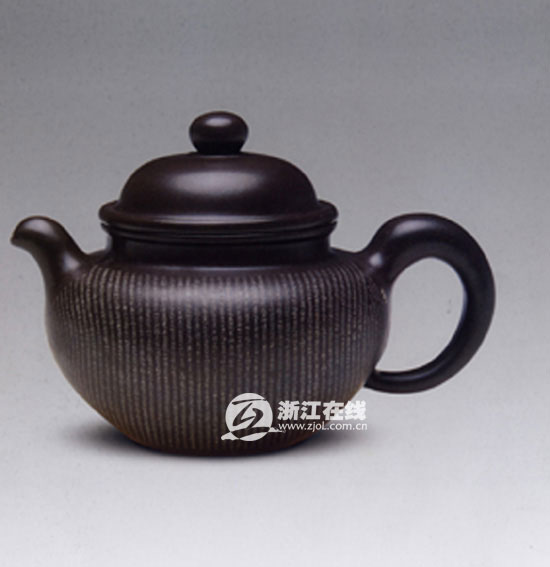 而作為程家紫砂壺工藝傳承人的程超,跟著父親學(xué)藝多年,技藝日臻成熟。一把微刻《茶經(jīng)》全文的陸羽壺,顯示出青出于藍(lán)而勝于藍(lán)的氣勢(shì)。身為湖州市工藝美術(shù)大師的他坦言,要像父親一樣成為國家級(jí)的陶瓷工藝美術(shù)大師。除了研究紫砂工藝,1970年代生的程超還承擔(dān)著推廣紫砂工藝的重任。今年西湖龍井開茶節(jié)上用于茶藝表演的那套黑釉紫砂壺,就是他和浙大茶葉系博導(dǎo)童啟慶教授、杭州茶樓協(xié)會(huì)共同設(shè)計(jì)制作的。