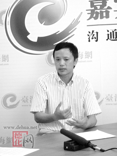 賴耀清:中共德化縣委統(tǒng)戰(zhàn)部副部長、德化縣工商聯(lián)主席。2007年4月8日,廈門德化經(jīng)濟文化促進會成立,賴耀清當(dāng)選秘書長。圖為賴耀清接受臺海網(wǎng)專訪。