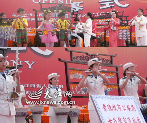 這兩年的瓷博會開幕式上,瓷樂表演一直成為媒體關(guān)注的焦點。今年,開幕式瓷樂演奏首次由4個瓷樂隊、80多個樂手同臺完成,除以往的專業(yè)瓷樂隊,來自臺灣地區(qū)和韓國的瓷樂表演藝術(shù)團體、老年大學瓷樂隊外,新成立不久的群藝館少兒瓷樂隊和警官瓷樂隊也加盟演出。在同一個舞臺上,全球愛好瓷樂的朋友,不分年齡和民族,在千年瓷都展現(xiàn)出陶瓷文化的無窮魅力。