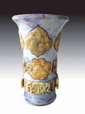 鈞窯是宋五大名窯之一,與汝、官、哥、定諸窯并駕齊驅(qū),此件宋官鈞窯鑲玉大花觚(見圖),體形碩大,造型優(yōu)美,撇口,直腹,圈足。尤其值得關(guān)注的是,在通高38厘米、口徑23.5厘米的觚體四面,鑲嵌著12塊古玉,觚底圈足內(nèi)凹,施醬色護胎釉,并在底面以金粉刻畫了一只金虁鳳圖案。 觚在中國古代青銅器時期即產(chǎn)生,以后逐步沿襲至陶器、瓷器,屬于古代的盛酒器,有圓形、方形,以圓形器為多見。此觚的雍容華貴在于觚上鑲嵌了12枚高浮雕古玉,3枚一組,共四面十二枚,玉件依據(jù)圓形觚的弧度精雕細作,然后粘貼于觚體上。