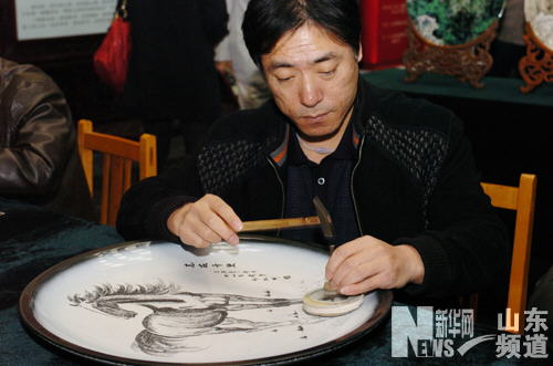 山東陶瓷藝人邢樹(shù)彬正在展示“刻瓷”技藝。