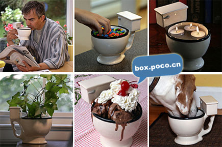 "馬桶"咖啡杯當(dāng)然是馬桶造型,除了用來(lái)當(dāng)杯子使,還可以用作花盆和狗盆--嗯,當(dāng)然,最適合它的還是一杯熱氣騰騰的咖啡,白色的陶瓷襯著褐色的咖啡,呃,能面不改色地喝下它們的都應(yīng)授予勇士勛章……另外,不太清楚"馬桶"的水箱只是裝飾性的,還是有具體的功能在里面,比如說(shuō)用作方糖的罐子,如果是后者,那無(wú)疑就更贊了。