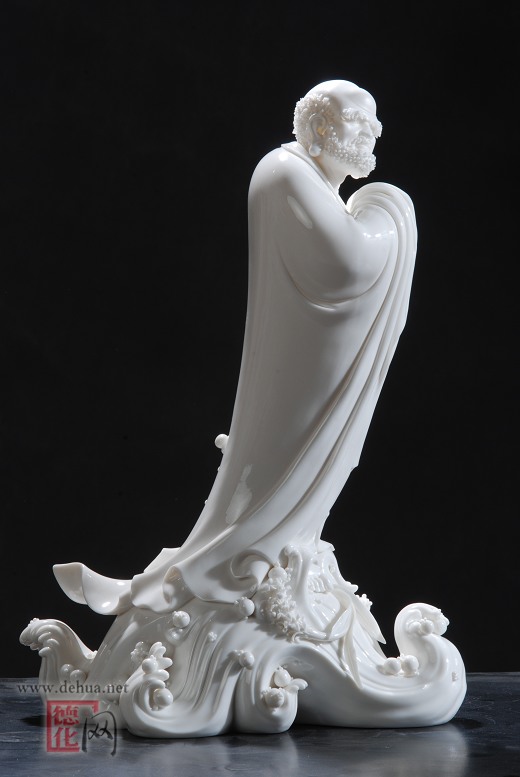 “路行跨水復逢著,獨自凄凄暗渡江。日下可憐雙象馬,二株嫩桂久昌昌。”《一葦渡江》這一千古流傳的經(jīng)典神話,早已深刻在人們的心中,是畫家、作家、雕刻家等非常好的題材。作品采用德化特有的“中國白”瓷雕,演繹出了佛法無邊的境界,腳踏一葉蘆葦,昂首屹立于浪尖上,給人一種空靈、超脫的心境。兩只突鼓的眼睛炯炯有神,滿臉絡(luò)腮胡子,卷曲盤旋,身材魁梧,形象端莊,儀態(tài)非凡。富有韻味的《渡》瓷雕造型,將美麗的神話獨具一格地亮相眼前。這不僅是藝術(shù)的體現(xiàn),更是一種信念,一種思想的超越,是禪的闡釋,完全將佛家修養(yǎng)、陶瓷藝術(shù)境界及思維信念完美相結(jié)合。