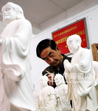 “老驥伏櫪,志在千里”,年過七旬的他想的不是享清福,而是探究如何突破德化陶瓷沒有大型“中國白”瓷雕的現(xiàn)狀,將德化陶瓷藝術(shù)推向高雅的藝術(shù)殿堂。大型成套“中國白”瓷雕《和善十八羅漢》和《夜光五百羅漢》的成功燒制初步達成了他的心愿,是他的一大手筆。它們的成功燒制引起了社會各界的強烈反響,作品特邀參加在江蘇無錫梵宮舉行的第二屆世界佛教論壇大會暨中國工藝美術(shù)大師佛教藝術(shù)珍品展,并被永久收藏、展示。