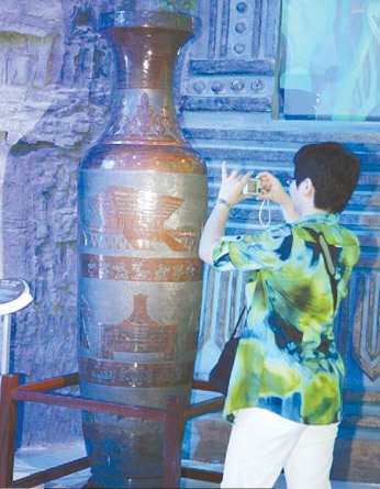 這個高2.2米,朱色的坭興陶大花瓶,名字叫“世博緣·壯鄉(xiāng)情”。場館負責人告訴記者,這是目前世界上最高的坭興陶花瓶,是廣西為世博量身訂造的一件展品。傳統(tǒng)的瓶形上,繪有豐富的世博元素和廣西元素。世博園中國館造型、世博吉祥物海寶的形象、世博會的會徽和廣西的山水、第四屆中國東盟博覽會會址廣西南寧國際會展中心等,交相呼應了瓶身上刻著的“城市,讓生活更美好”和“綠色家園·藍色夢想”的兩個主題,表達了壯鄉(xiāng)人民迎世博、參與世博的真摯情感,也引起了不少游客的關(guān)注。