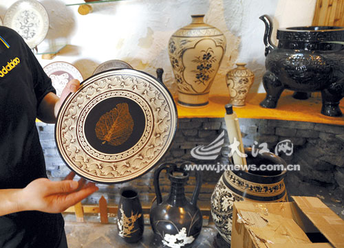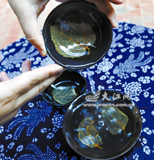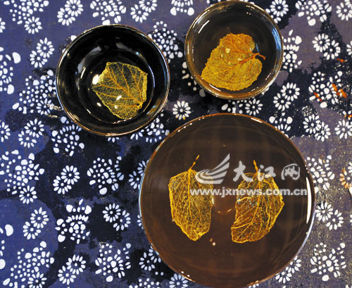 深黑的釉面上,鑲嵌著幾片紋理清晰的樹(shù)葉,注入茶水,盞壁上的葉子飄然水面,美不勝收。伍映山告訴我們,這就是吉州古陶瓷研究所依照早已失傳的燒造方法燒制出的吉州窯精品——木葉天目瓷。
