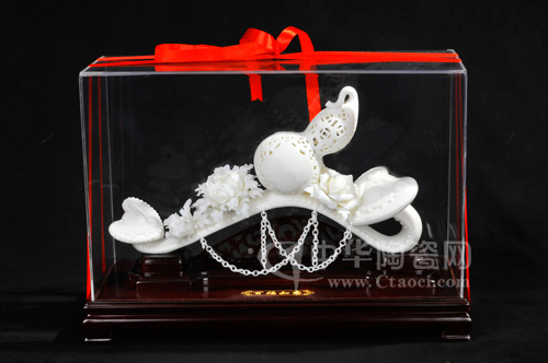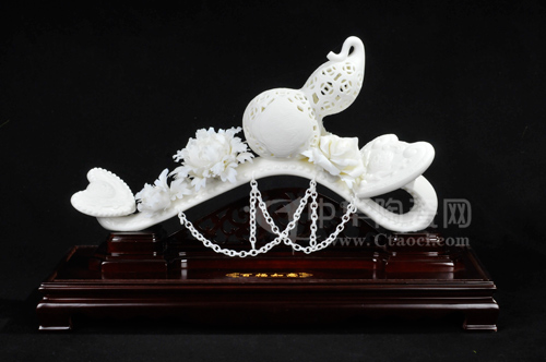 高級(jí)工藝美術(shù)師蘇志強(qiáng)善于揉合中華傳統(tǒng)文化的諸多元素,在瓷塑作品中取如意為主體,配以葫蘆,構(gòu)思簡(jiǎn)單明了,主題“百福如意”呼之欲出。作品并以雍容華貴的牡丹、嬌艷欲滴的玫瑰點(diǎn)綴其間,展現(xiàn)一派欣欣向榮的景象,蘊(yùn)含著祥瑞吉慶之意。(蘇曉霞)